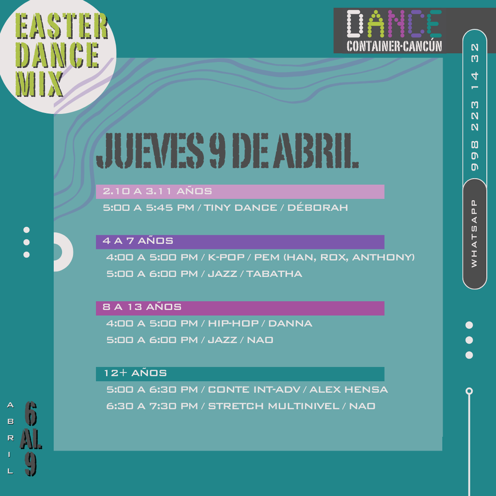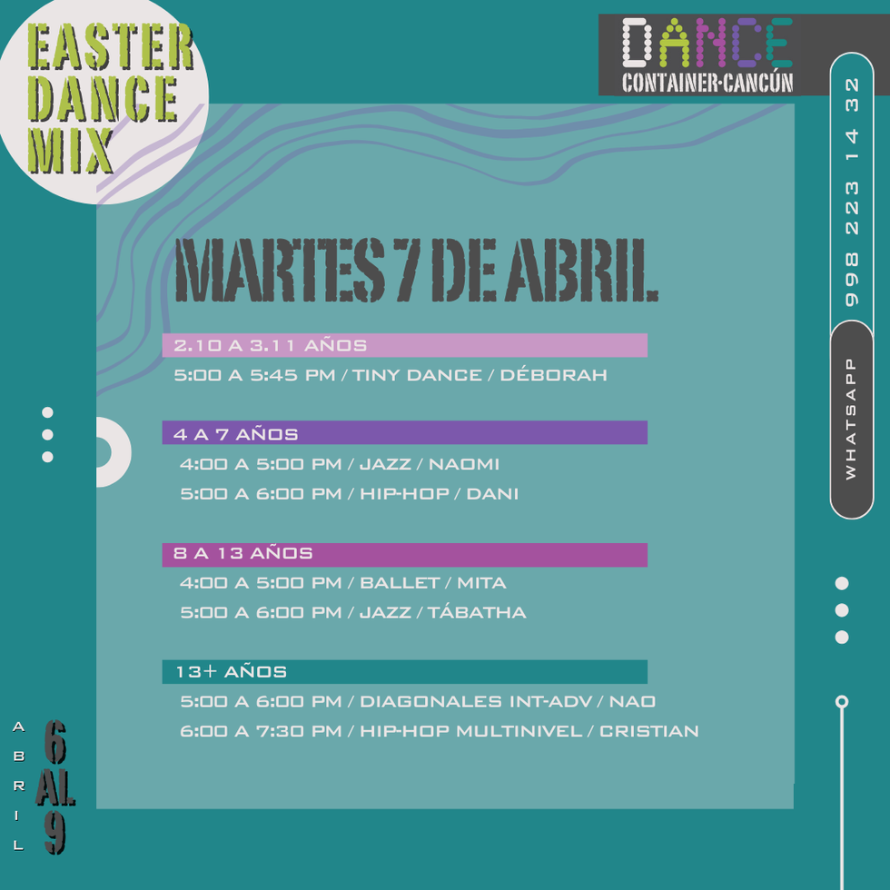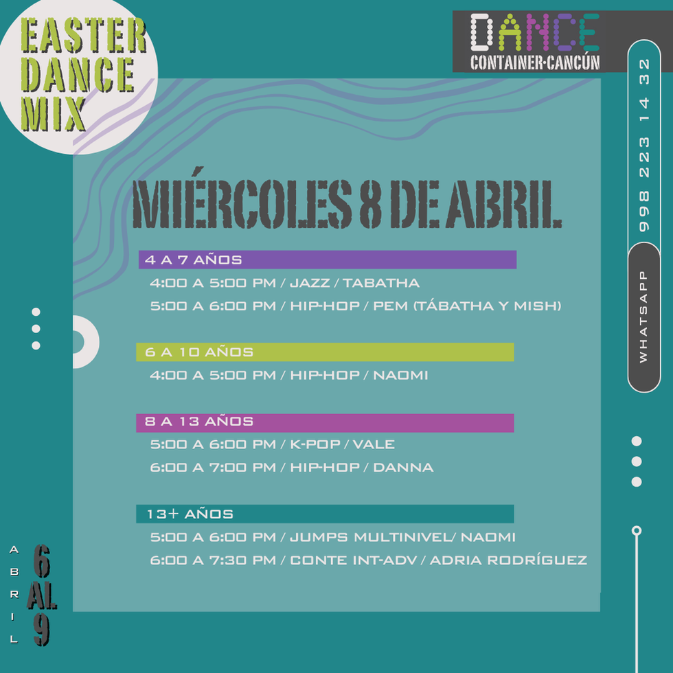 Easter Dance Mix es una excelente opción si buscas una actividad estructurada, divertida y formativa, donde los alumnos pueden conocer cómo es tomar clases en nuestra escuela durante una semana.